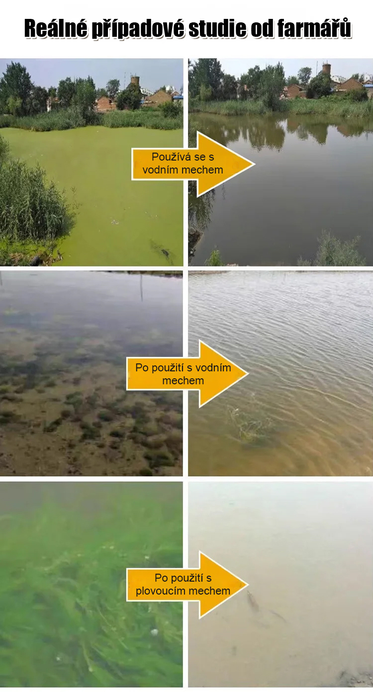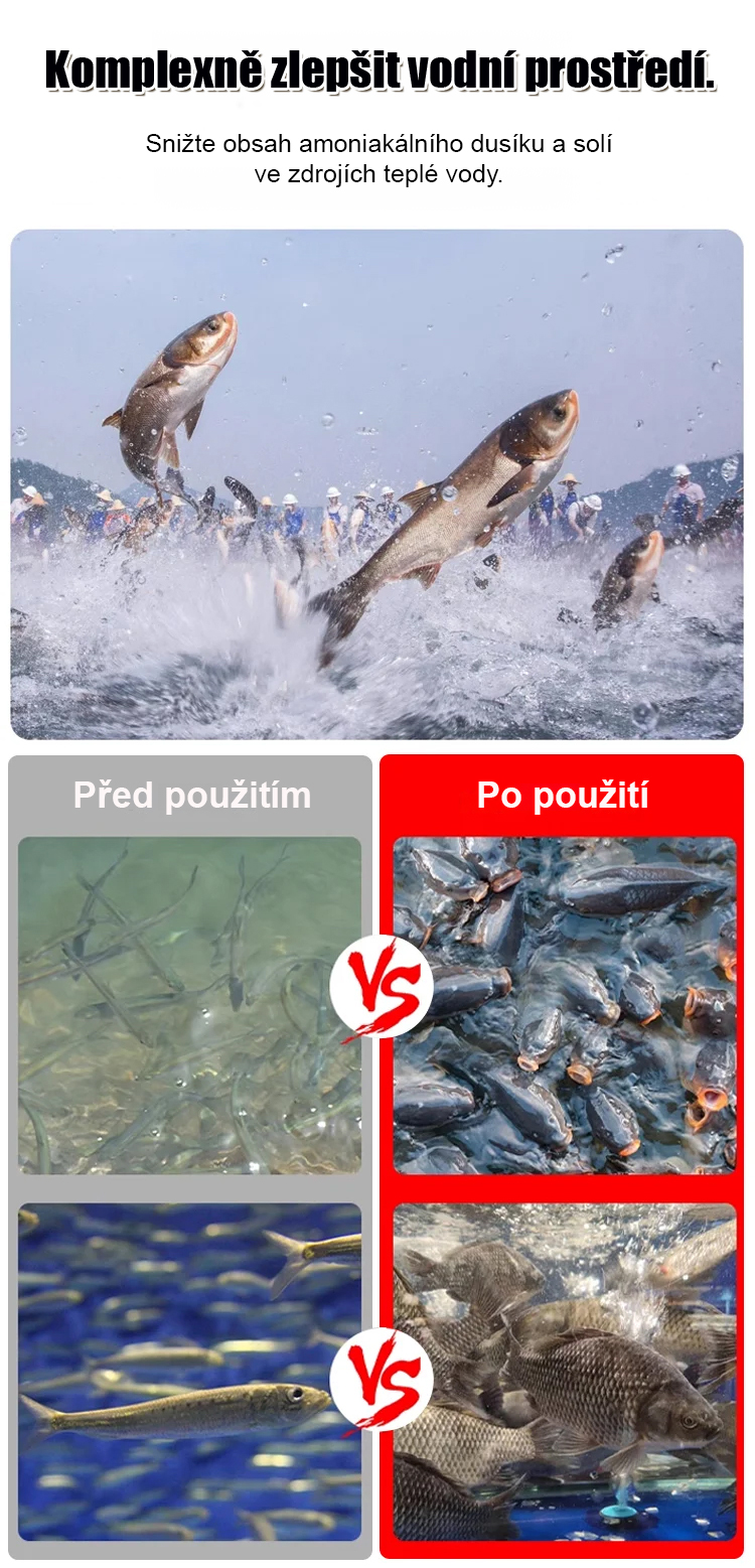 ✅ Zvýšení obsahu rozpuštěného kyslíku: Odstraňuje zakalení, obnovuje čistotu vody, ryby a krevety se již nevznášejí na hladině a jsou plné života.